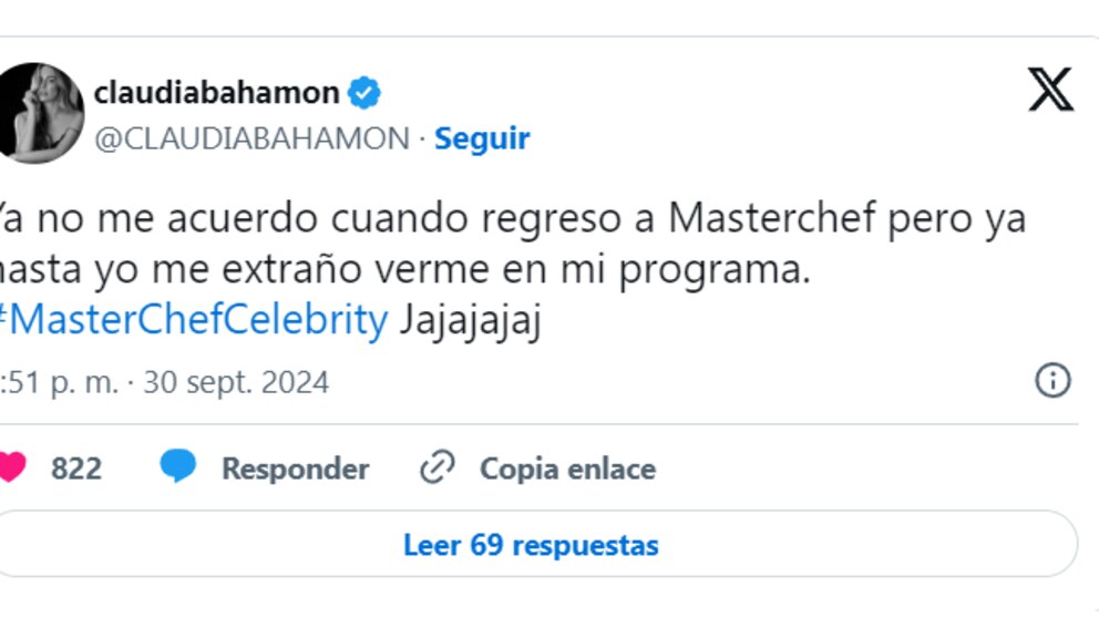 “Nos eliminaron a Ilenia porque no hicieron el reto de salvación y los chefs se fueron directo al de eliminación”, “gran falta que haces ese programa necesita de la persona que le da identidad al mismo pilas que Vicky te está haciendo el cajón”, “el programa sin Claudia y con Cony aun metida a la brava provoca ver más el boletín del consumidor”, “me imagino como hubiera sido tu reacción de haber estado en la eliminación tan triste de Ileana”, “ya no más Pacífico, ni más vacaciones”, son parte de las reacciones que dejó la publicación de Claudia en X.