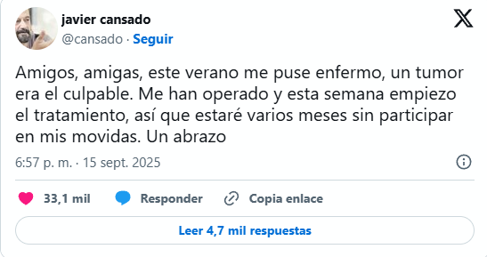 «Me puse enfermo, un tumor era el culpable. Me han operado y esta semana empiezo el tratamiento, así que estaré varios meses sin participar en mis movidas». Con este mensaje publicado en la red social X, el humorista Javier Cansado, de 69 años, anunció su retirada temporal de los escenarios para comenzar un tratamiento contra el cáncer que padece.