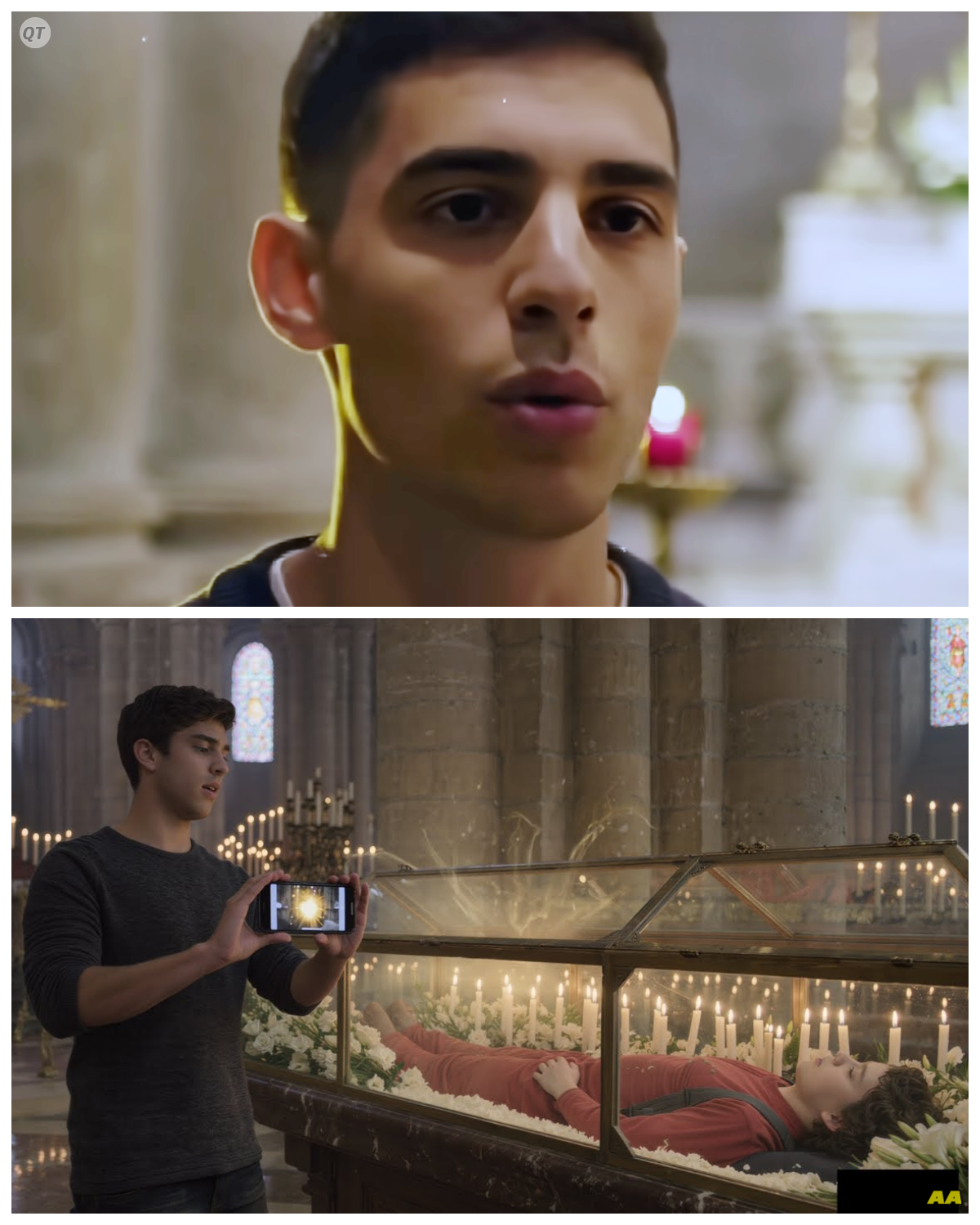Sostuve el teléfono horizontalmente y moví lentamente la cámara desde la izquierda hacia la derecha, enfocando primero las velas, luego la urna de cristal con el cuerpo de Carlo y finalmente el altar al fondo.