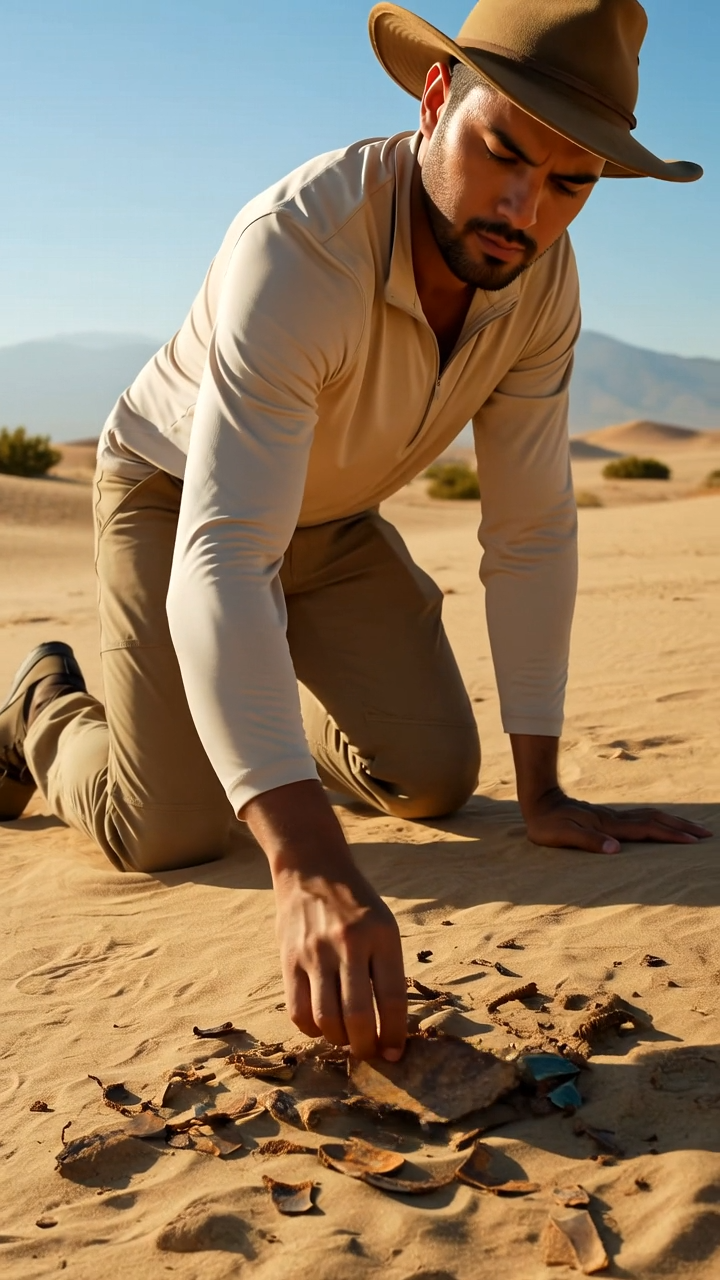 Tras la tormenta, cuando los vientos finalmente se calmaron y el sol volvió a brillar sobre las dunas doradas, un grupo de exploradores locales aficionados a la búsqueda de fósiles, artefactos históricos y minerales raros, que recorría sistemáticamente la zona en busca de tesoros enterrados por el tiempo.